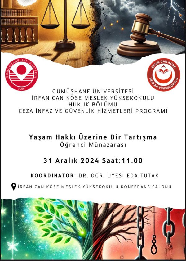 Üniversitemiz İrfan Can Köse Meslek Yüksekokulu Hukuk Bölümü Ceza İnfaz ve Güvenlik Hizmetleri Programı tarafından Hukuk Bölüm Başkanı Dr. Öğr. Üyesi Eda TUTAK koordinatörlüğünde “Yaşam Hakkı Üzerine Bir Tartışma: Öğrenci Münazarası” adlı etkinlik 31 Aralık Salı günü saat 11.00’da İrfan Can Köse Meslek Yüksekokulu Konferans Salonu'nda gerçekleştirilecektir.