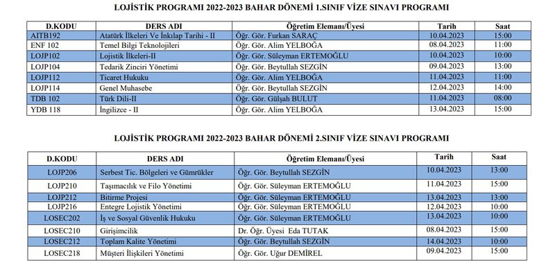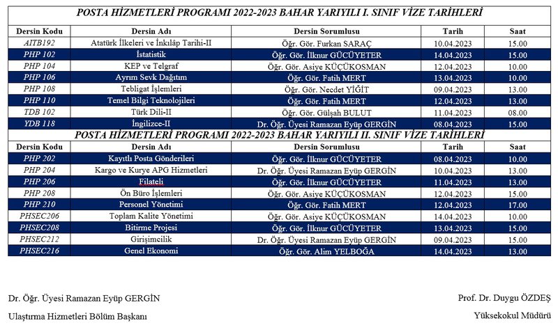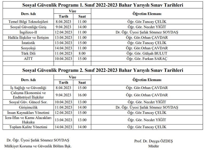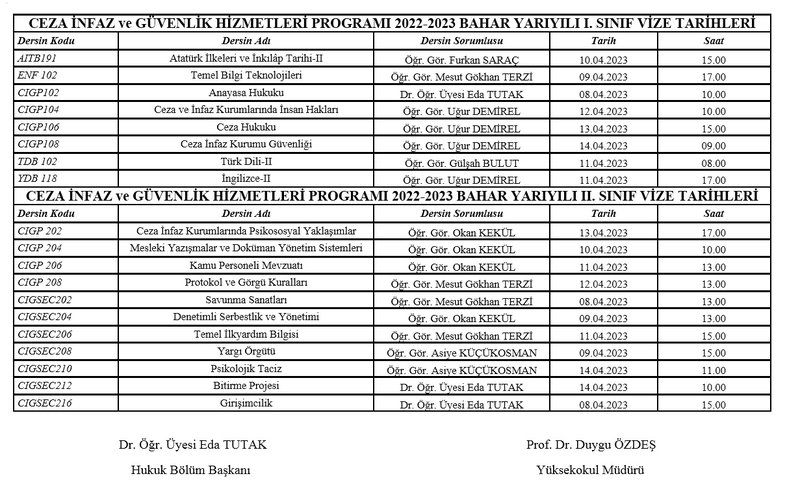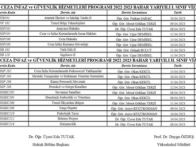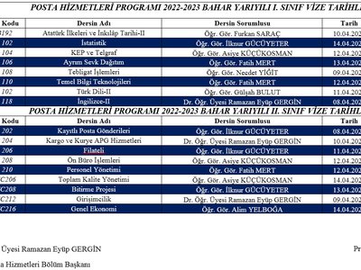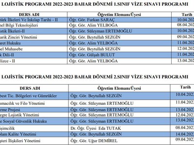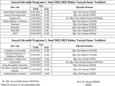 2022-2023 Bahar Dönemi Vize Sınav Programı yayınlanmıştır. Öğrencilerimize vize sınavlarında başarılar dileriz.