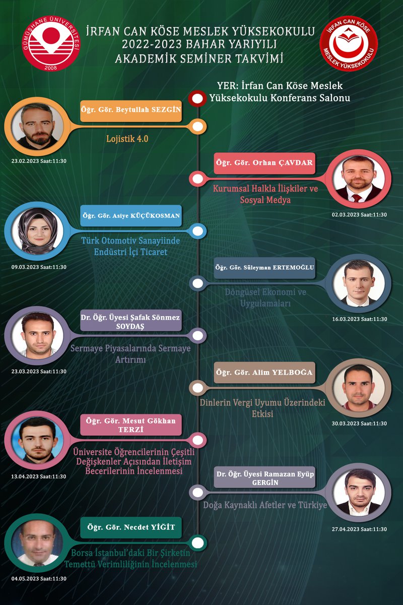2022-2023 Bahar Yarıyılında Meslek Yüksekokulumuzda farklı uzmanlık alanlarına sahip olan hocalarımız, kendi alanlarına dair güncel ve önemli konular hakkında akademik seminerler gerçekleştirecektir.Gerçekleştirilecek seminerler ile sosyal bilimler alanında disiplinlerarası bir bakış açısıyla akademik ve mesleki gelişime katkı sunulması planlanmaktadır.