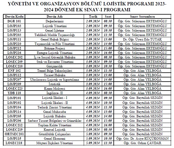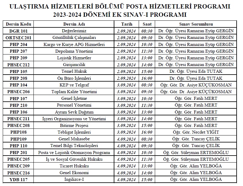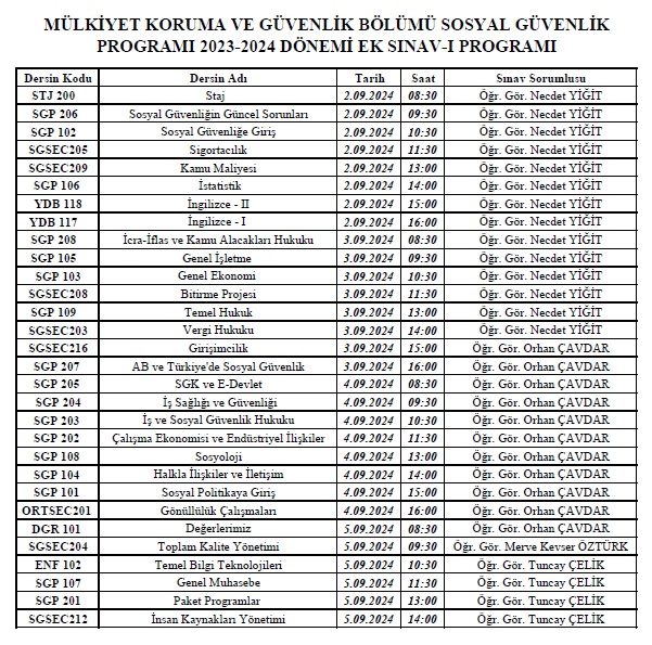 2023-2024 Eğitim- Öğretim Dönemi Bahar Yarıyılı Ek-1 Sınav Programı