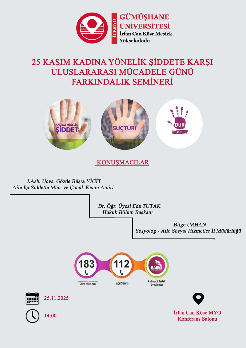 25 Kasım 2025 saat 14.00’te İrfan Can Köse Meslek Yüksekokulu Konferans Salonumuzda, kadına yönelik şiddetle mücadeleye dikkat çekmek amacıyla bir farkındalık semineri gerçekleştirilecektir. Seminere; Gümüşhane İl Jandarma Komutanlığı Aile İçi Şiddetle Mücadele ve Çocuk Kısım Amiri J. Asb. Üçvş. Gözde Büşra YİĞİT, Yüksekokulumuz Hukuk Bölüm Başkanı Dr. Öğr. Üyesi Eda TUTAK ve Aile ve Sosyal Hizmetler İl Müdürlüğü Sosyoloğu Bilge URHAN konuşmacı olarak katılacaktır.