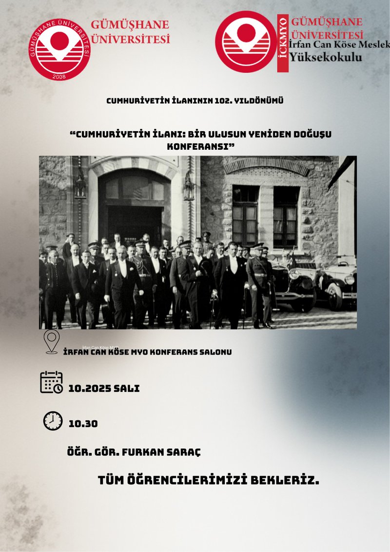 İrfan Can Köse Meslek Yüksekokulumuzun Konferans Salonunda 28.10.2025 Salı günü, saat 10.30’da öğretim elemanlarımızdan Öğr. Gör. Furkan SARAÇ tarafından gerçekleştirilecek olan “Cumhuriyetin İlanı: Bir Ulusun Yeniden Doğuşu” başlıklı konferansımıza tüm akademisyenler ve öğrencilerimiz davetlidir.