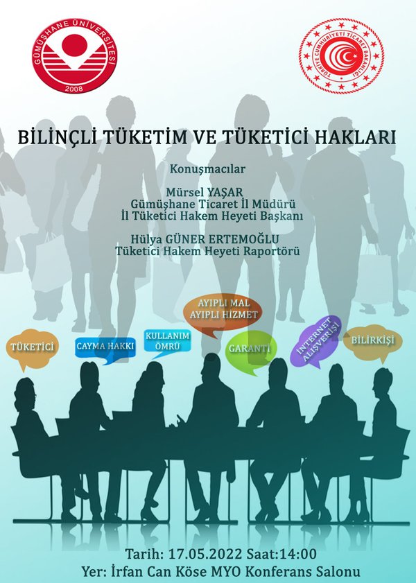Gümüşhane Üniversitesi İrfan Can Köse Meslek Yüksekokulu tarafından Gümüşhane Ticaret İl Müdürlüğü’nün katkılarıyla Ticaret İl Müdürü Sayın Mürsel YAŞAR ve Tüketici Hakem Heyeti Raportörü Sayın Hülya ERTEMOĞLU’nun konuşmacı olarak katılacağı “Bilinçli Tüketim ve Tüketici Hakları” konulu konferans düzenlenecektir.
