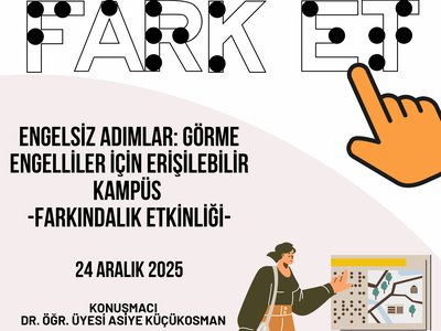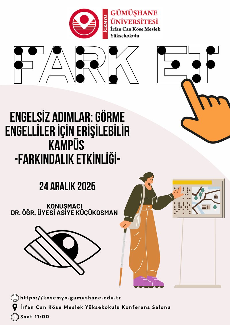 Görme engelli bireylerin kampüs yaşamında karşılaştıkları zorluklara dikkat çekmek, erişilebilirlik konusunda farkındalık oluşturmak ve toplumsal duyarlılığı artırmak amacıyla Gönüllülük Çalışmaları dersi kapsamında düzenlenen, Mülkiyet Koruma ve Güvenlik Bölüm Başkanı Dr. Öğr. Üyesi Asiye KÜÇÜKOSMAN ve bölüm öğrencilerinin konuşmacı olarak yer alacağı etkinlik 24 Aralık 2025 saat 11.00’de İrfan Can Köse Meslek Yüksekokulu Konferans Salonumuzda gerçekleştirilecektir.