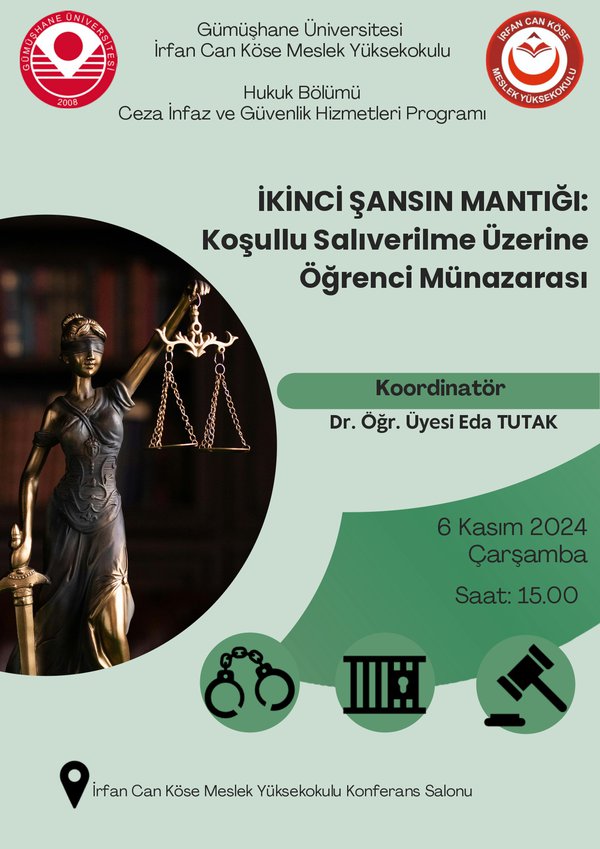 İrfan Can Köse Meslek Yüksekokulu Hukuk Bölümü Ceza İnfaz ve Güvenlik Hizmetleri Programı 2.sınıf öğrencileri tarafından Hukuk Bölüm Başkanı Dr. Öğr. Üyesi Eda TUTAK koordinatörlüğünde “İkinci Şansın Mantığı: Koşullu Salıverilme Üzerine Öğrenci Münazarası” adlı etkinlik 6 Kasım Çarşamba günü saat 15.00’te İrfan Can Köse Meslek Yüksekokulu Konferans Salonu'nda gerçekleştirilecektir.