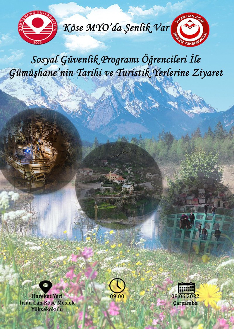 Meslek Yüksekokulumuz Mülkiyet Koruma ve Güvenlik Bölümü Sosyal Güvenlik Programı tarafından 08.06.2022 tarihinde (Çarşamba günü) “Teknik Gezi” ardından “Kültür Gezisi” düzenlenecektir. Etkinlik kapsamında; Teknik gezi olarak SGK İl Müdürlüğü ziyaret edilecek ardından kültürel gezi olarak Karaca Mağarası, Torul Kalesi Cam Seyir Terası ve Süleymaniye Mahallesi (Eski Gümüşhane) ziyaret edilerek gezilecektir. Etkinliğimize tüm Sosyal Güvenlik Programı öğrencilerimiz davetlidir.