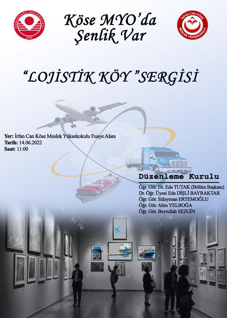 Gümüşhane Üniversitesi İrfan Can Köse Meslek Yüksekokulu tarafından hazırlanan 1. Akademi, Kültür, Sanat ve Spor Şenlikleri kapsamında Yönetim ve Organizasyon Bölümü Lojistik Programı tarafından “Lojistik Köy” sergisi düzenlenecektir. 14 Haziran 2022 tarihinde saat 11.00’de İrfan Can Köse Meslek Yüksekokulu Fuaye Alanında gerçekleştirilecek “Lojistik Köy Sergisi” Lojistik Programı 2.sınıf öğrencileri tarafından Bitirme Projesi dersi kapsamında hazırlanmıştır. Sergi kapsamında Türkiye’de bulunan lojistik köylerin tanıtımının yapıldığı afişler ve öğrencilerimiz tarafından tasarlanan el yapımı maketler yer almaktadır.