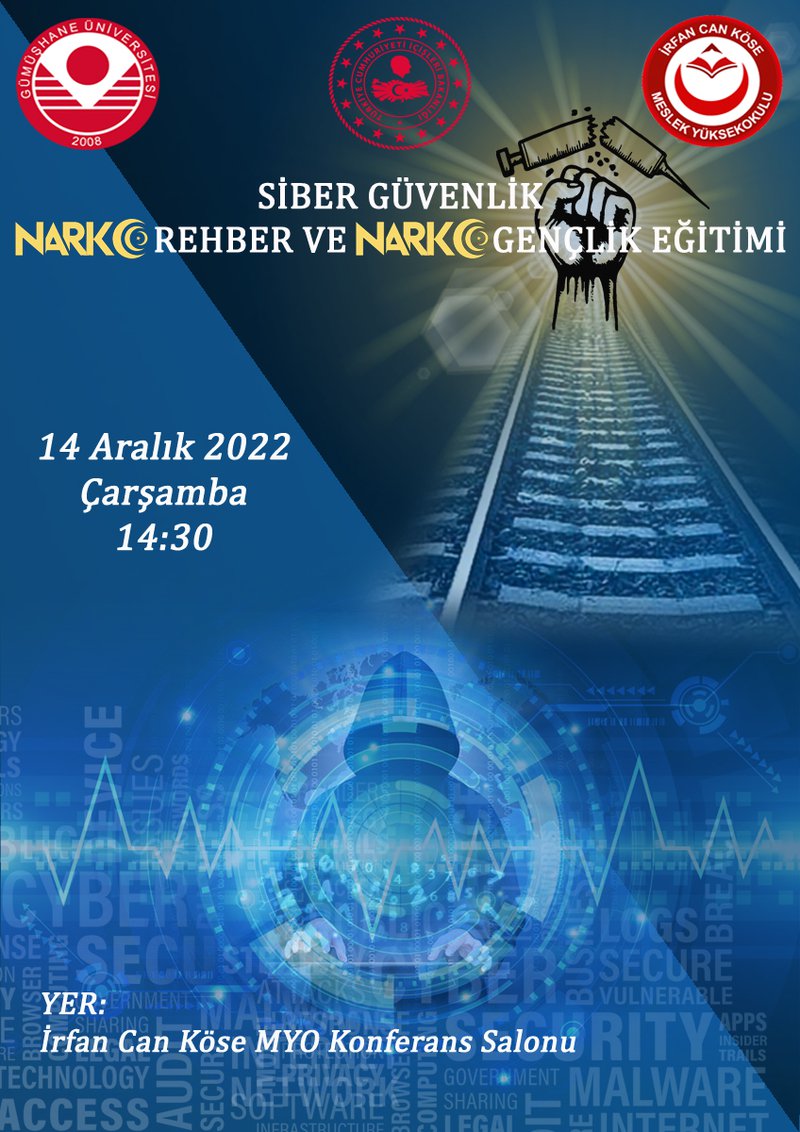 T.C. İçişleri Bakanlığı Emniyet Genel Müdürlüğü, Gümüşhane Emniyet Müdürlüğü ve İrfan Can Köse Meslek Yüksekokulu işbirliğiyle 14.12.2022 saat 14:30’da Meslek Yüksekokulumuz konferans salonunda toplumsal bilinçlendirme eğitimi gerçekleştirilecektir.