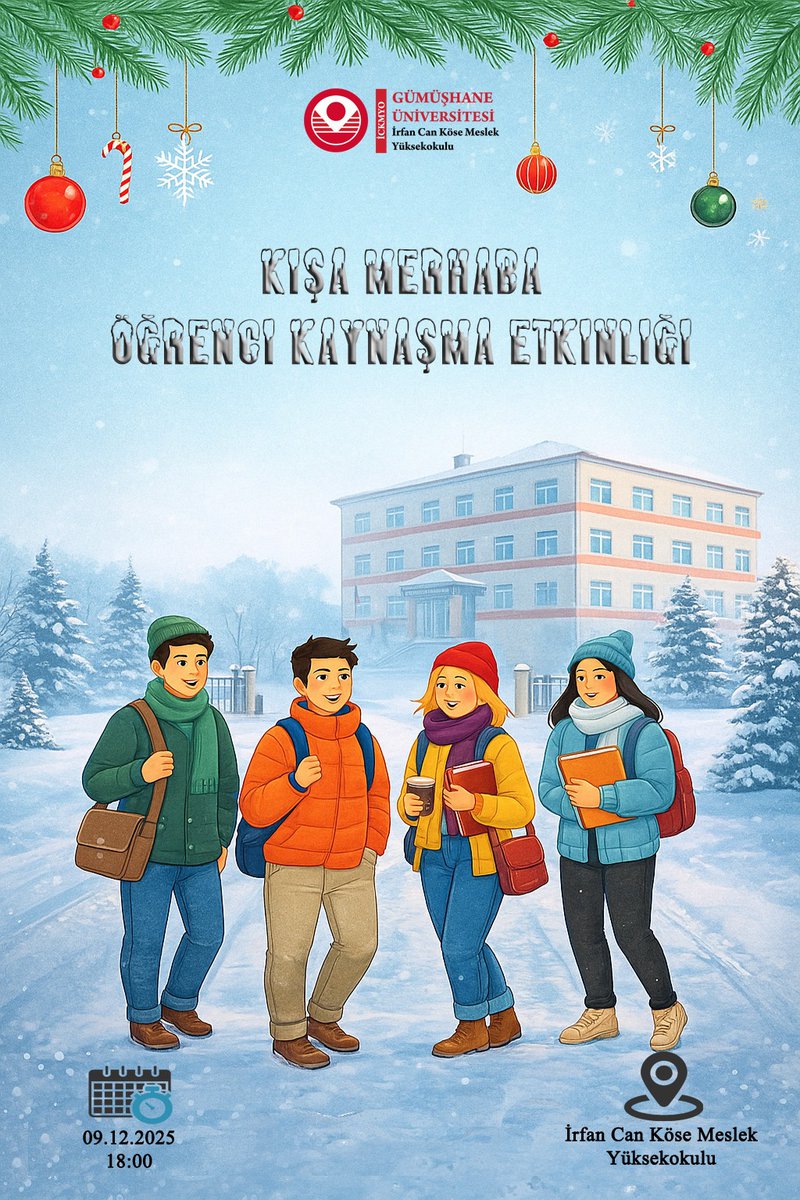 Gümüşhane Üniversitesi İrfan Can Köse Meslek Yüksekokulu tarafından öğrencilerimizin birbirleriyle tanışması, iletişim kurması ve keyifli bir ortamda bir araya gelmesini sağlamak amacıyla “Kışa Merhaba – Öğrenci Kaynaşma Etkinliği” düzenlenecektir.