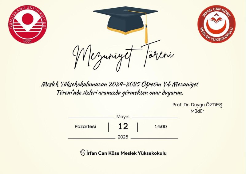İrfan Can Köse Meslek Yüksekokulumuzdan 2024-2025 Eğitim-Öğretim yılında mezun olan öğrencilerimizin mezuniyet töreni 12 Mayıs 2025 Pazartesi günü saat 14:00’de İrfan Can Köse Meslek Yüksekokulu Kampüs Alanında yapılacaktır.