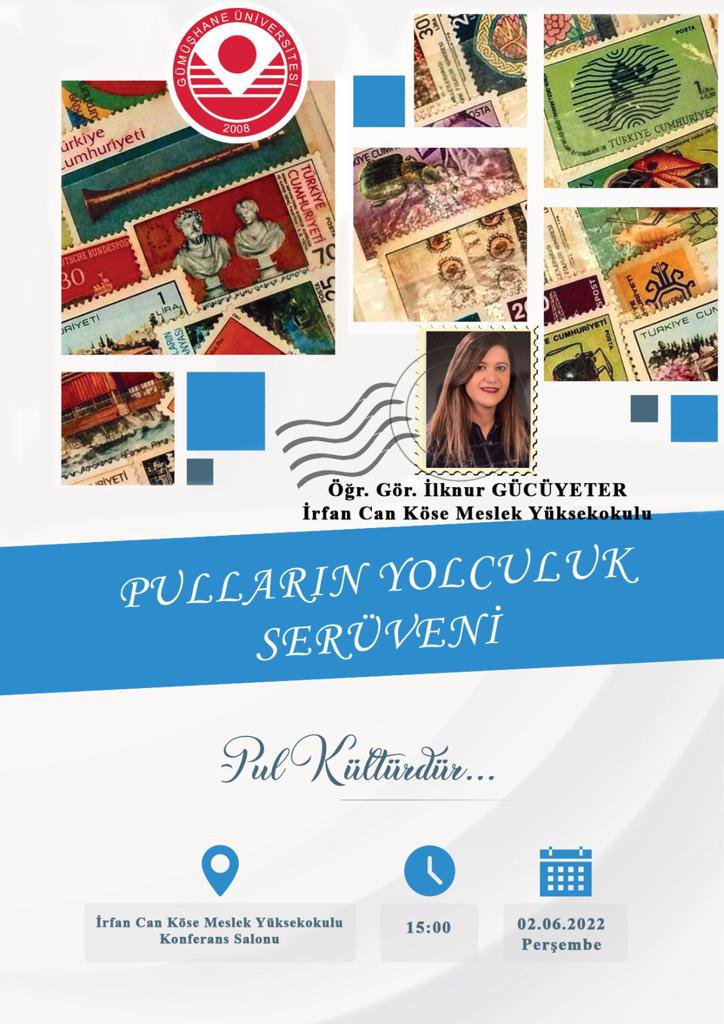 Gümüşhane Üniversitesi İrfan Can Köse Meslek Yüksekokulu Ulaştırma Hizmetleri Bölümü Posta Hizmetleri Programı Öğr. Gör. İlknur GÜCÜYETER’in anlatımıyla “Pulların Yolculuk Serüveni” konulu seminer düzenlenecektir.