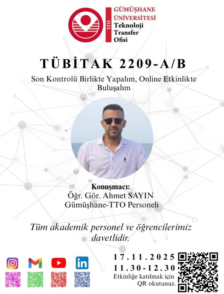 TÜBİTAK 2209-A/B programına yönelik “Son Kontrolü Birlikte Yapalım Online Etkinlikte Buluşalım” çevrim içi bilgilendirme etkinliği 17 Kasım 2025 tarihinde saat 11.30’da gerçekleştirilecektir. Etkinliğe katılmak isteyen tüm akademik personellerimiz ve öğrencilerimiz, katılım bağlantısına afişte yer alan QR kod üzerinden ulaşılabilir.