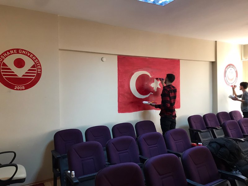 İrfan Can Köse Meslek Yüksekokulu Lojistik 2. Sınıf öğrencileri Bölüm başkanı Öğr. Gör. Süleyman ERTEMOĞLU ve Öğr. Gör. Alim YELBOĞA ile birlikte “AL BAYRAĞIN GÖLGESİNDE” adlı sloganla gönüllülük çalışması dersi kapsamında Yüksekokulumuzun konferans salonu duvarına Türk Bayrağı ile Üniversitemiz ve Yüksekokulumuzun logolarını akrilik boya ile resmettiler.