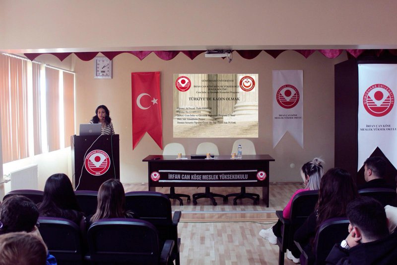 Hukuk Bölüm Başkanı Dr. Öğr. Üyesi Eda TUTAK tarafından yürütülen Gönüllülük Çalışmaları Dersi kapsamında Ceza İnfaz ve Güvenlik Hizmetleri Programı 2. sınıf öğrencilerinden Öykü ERMİCİK “Türkiye’de Kadın Olmak” temalı bir sunum gerçekleştirdi.